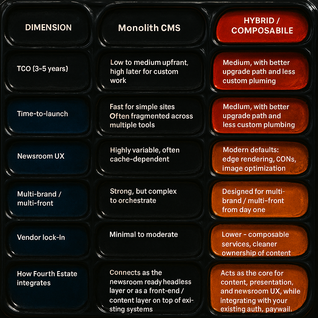 This article is for the people stuck in the middle of that debate – tech leads, product owners, and editors who keep getting dragged into architecture discussions they never asked for. It’s not a sales pitch and it’s not a theology fight about “the one true CMS”. It’s a practical guide to choosing between monolith, headless, and hybrid/composable setups based on three things that actually matter in news: total cost of ownership, newsroom UX, and performance.